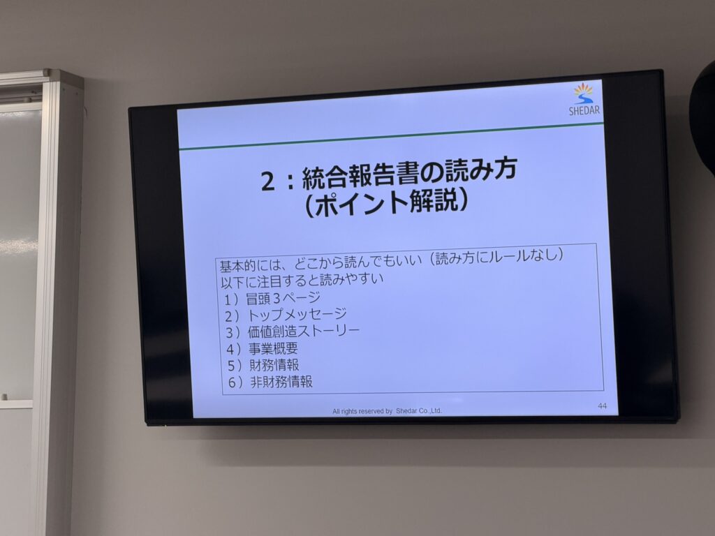 最初に、統合報告書の読み方について、簡単に解説を行いました。100ページ以上ある統合報告書も少なくありません。
