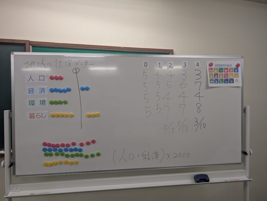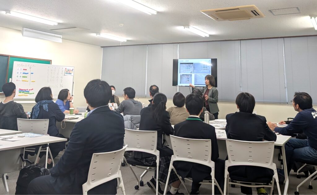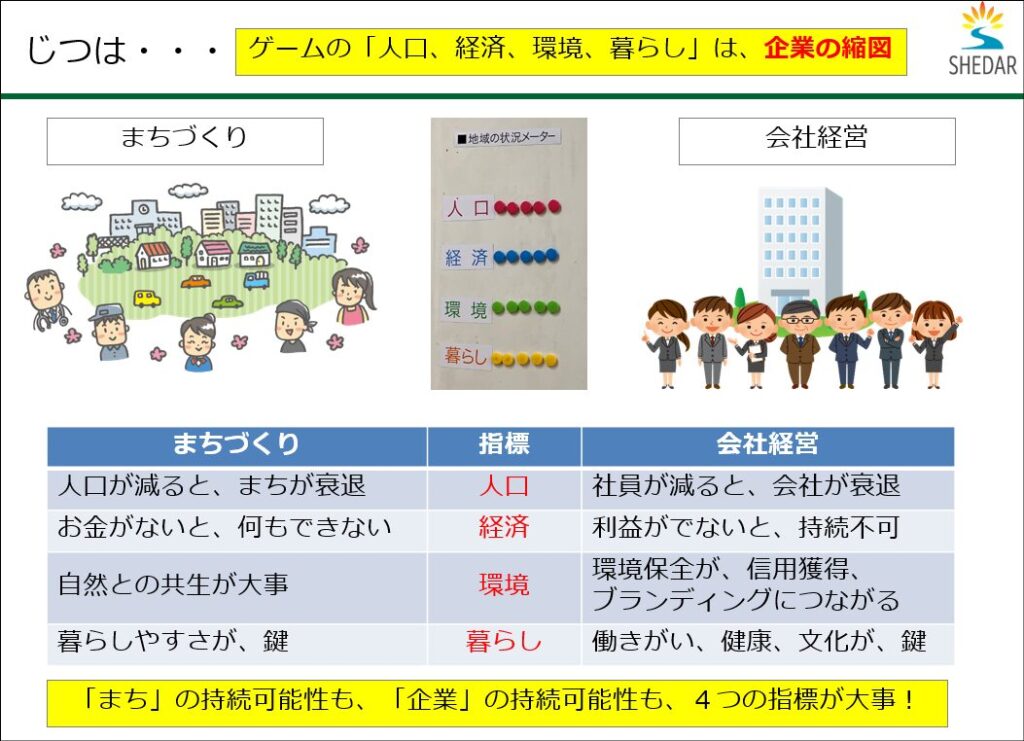 今回は時間の都合で実施できませんでしたが、企業向けの研修では、「ゲームの4つの指標(人口・経済・環境・暮らし)を、自社に当てはめると、現状はどうか?今後どんなことに取り組みたいか?」を考えるワーク を実施することも多いです。