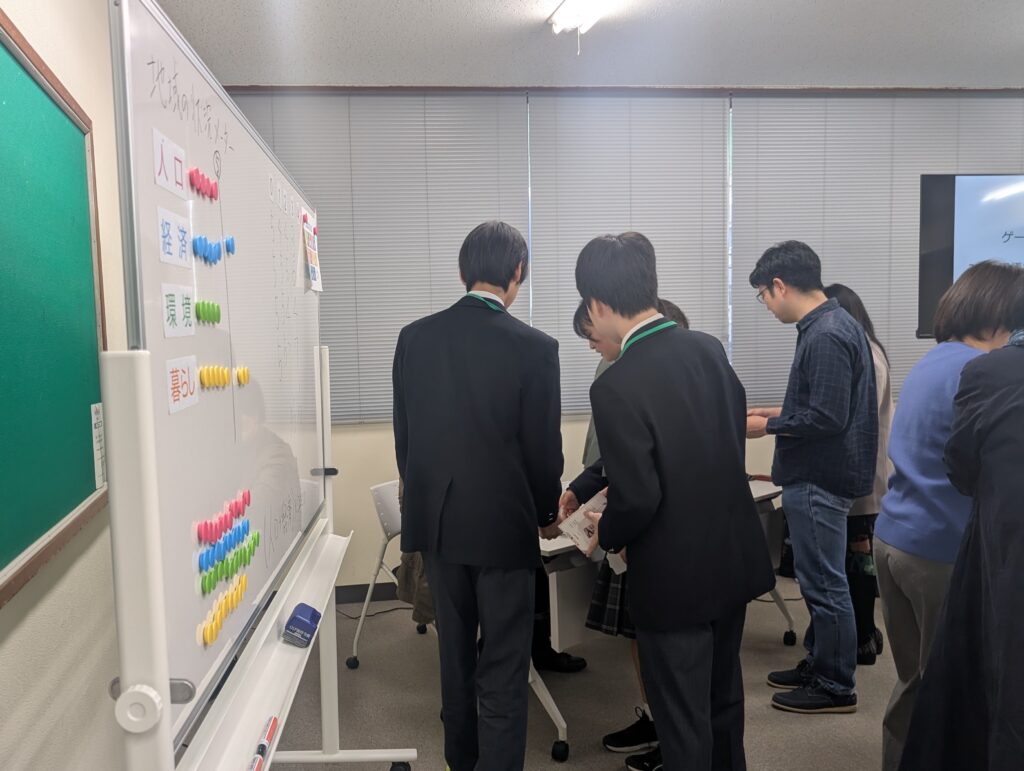 トレードオフも起こります。「経済には寄与したけど、まちの環境を壊してしまった」や「人口が増えると思ったのに、逆に暮らしにくいまちになってしまった」など、あちこちから反省の声も聞こえます。なぜそのような結果を引き起こしてしまったのかは、ゲームのあとの「振り返り」の時間に、ディスカッションすることで理解を深めていきます。