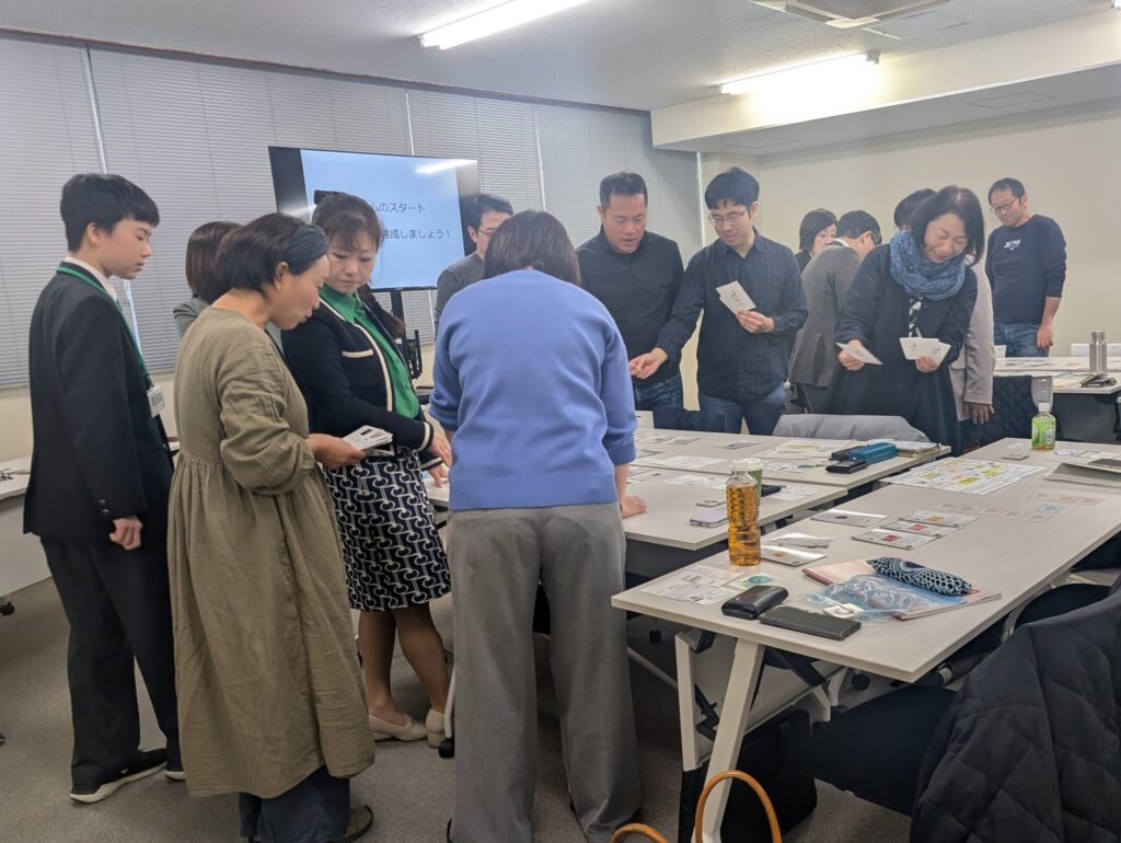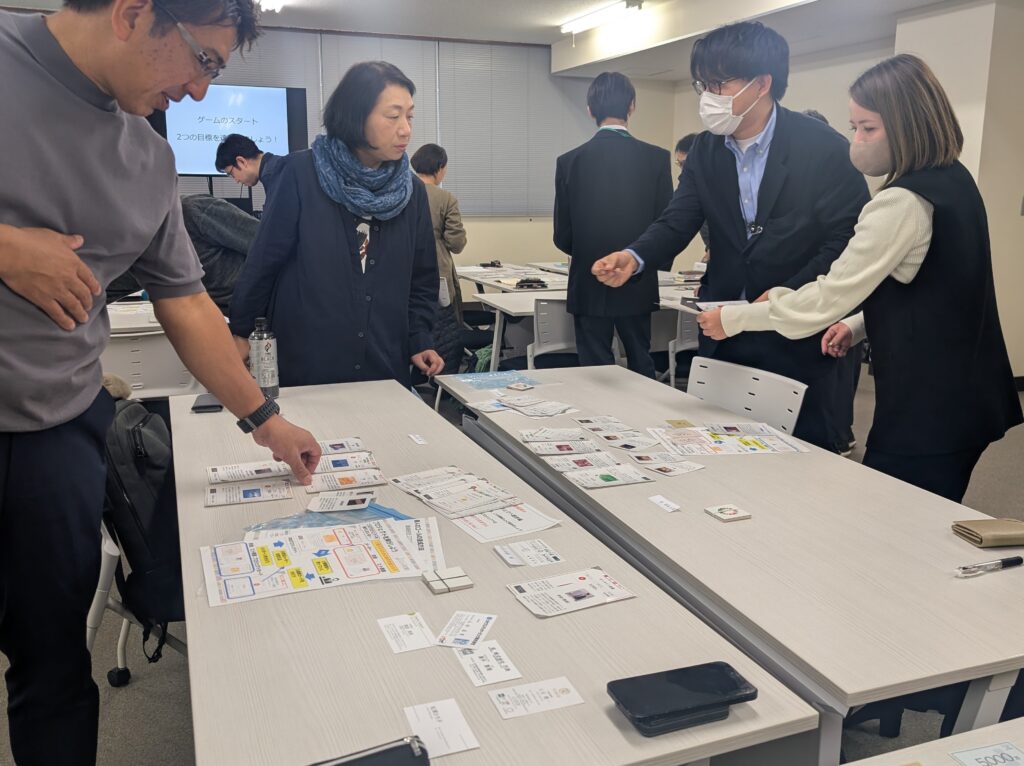地方創生カードゲームは、サステナビリティへの最初の一歩として、初心者向けの入門研修でよく活用されます。参加者全員で協力し、「持続可能なまち」の実現を目指します。