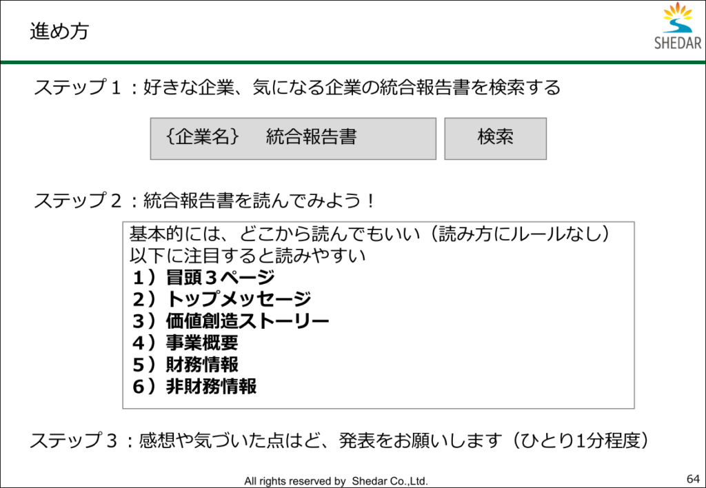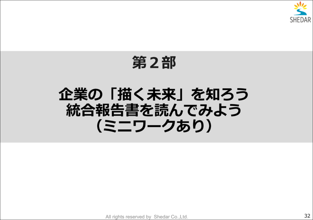 | 内容 | 1:株式会社シェダルの紹介とサステナビリティ 2:企業の描く未来を知ろう ~統合報告書を読んでみよう~ (ミニワーク) 3:質疑応答 |
