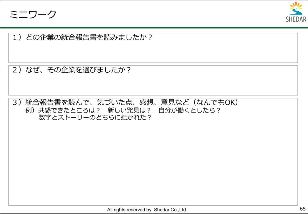ミニワークでは、「自分が気になる企業、好きな製品を作っている企業、いま、机の上にある飲み物やペンなどのメーカーでもいいよ」と伝え、企業のWebサイトから、統合報告書を探して読んでもらいました。